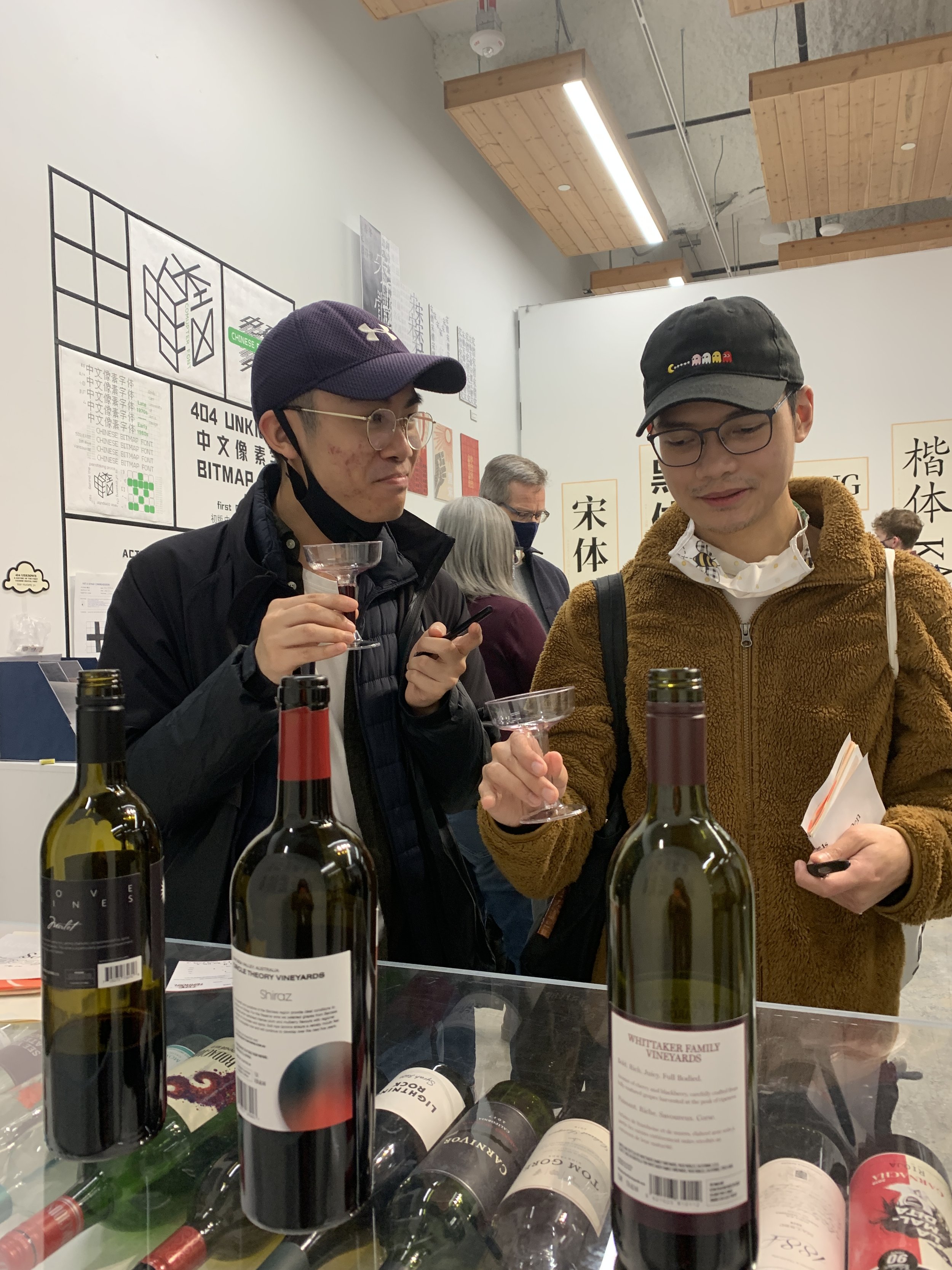 Opening night of the exhibition featured a wine tasting experiment. Participants were served wine from one of five bottles, each with a label designed in a different typographic style. Participants were led to believe that each bottle contained a different wine, when in reality each contained the same exact wine. This allowed for authentic insights into how typography functions and affects the way we perceive the quality and taste of wine. Some participants tasted from multiple bottles in a row and proclaimed they sensed noticeable differences between them, despite the fact that each bottle contained the same wine. Oh, the power of typography!